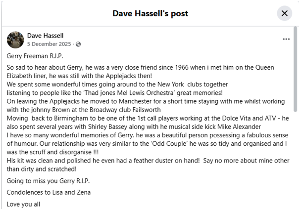Sadly, Gerry passed away in early December 2025. He was a great drummer and a lovely man. Andrew feels privileged to have got to know him through the wonderful Zooms and writing the book on The Applejacks, which now forms part of Gerry’s legacy. He will be greatly missed.